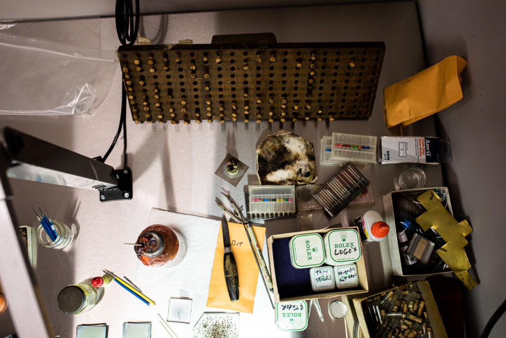 In this stage, we first reattach the figures to the dial face. When the figures are reapplied, we paint each one with luminous.